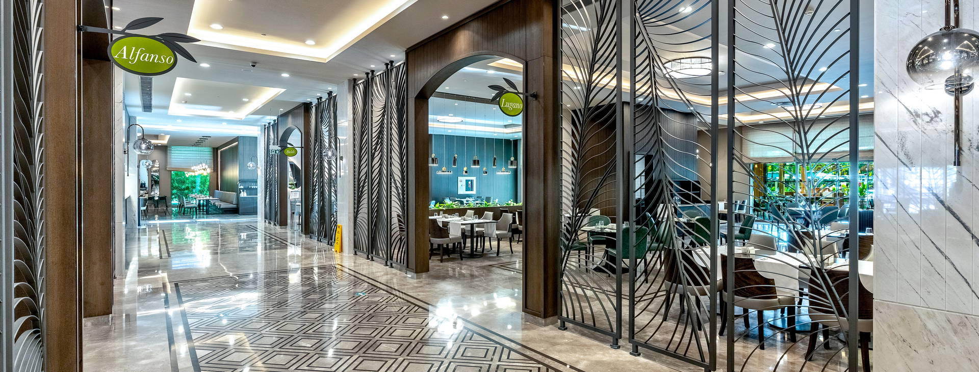 Ultra All Inclusive: raňajky (6:30-11:00), obedy (12:30-15:00), večere (19:00-22:00) podávané formou bohatého bufetu v hlavnej reštaurácii. Nočný bufet (22:00-07:00), nedeľný brunch (11:00-15:00); veľmi široký výber občerstvenia počas dňa: sendviče, šaláty, zmrzlina, rýchle občerstvenie, domáce čokolády a dezerty (09:00-23:00). Nealkoholické nápoje, miestne alkoholické nápoje a niektoré importované nápoje k dispozícii 24 h v lobby bare (v ostatných baroch počas otváracích hodín). Za príplatok: reštaurácia Teppanyaki, Alia Beach Club a reštaurácia Sevk-Et Steakhouse.