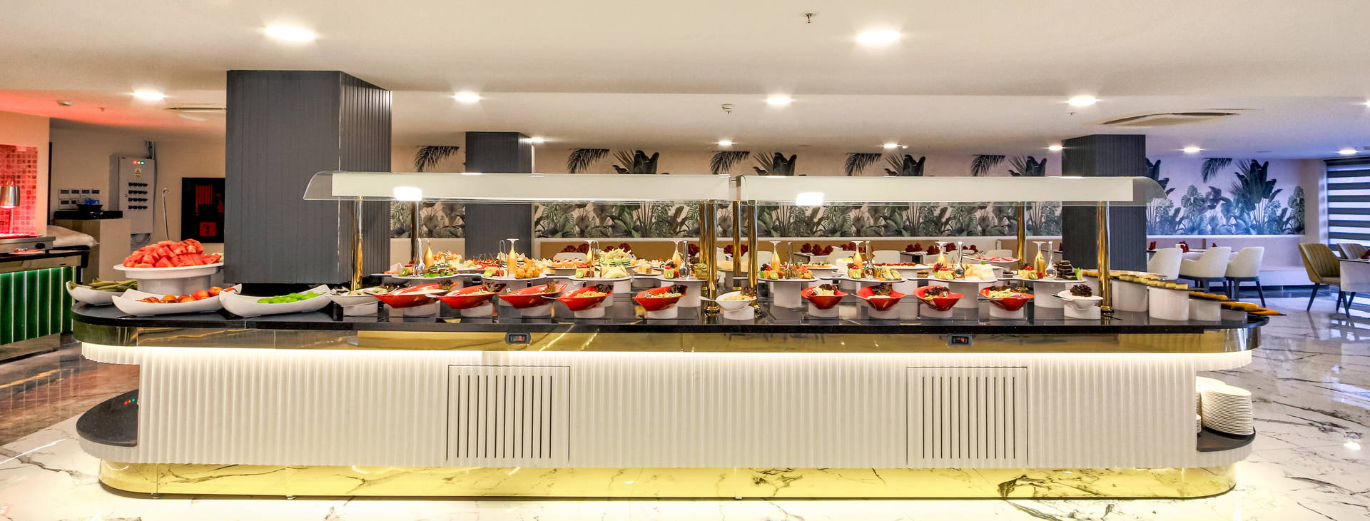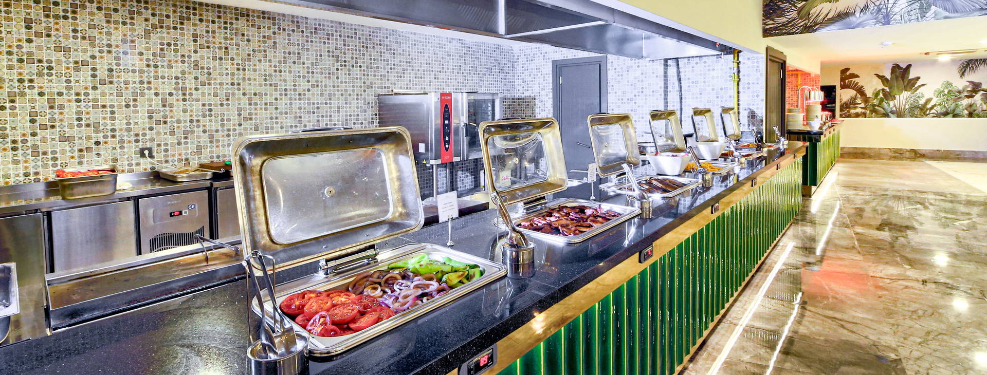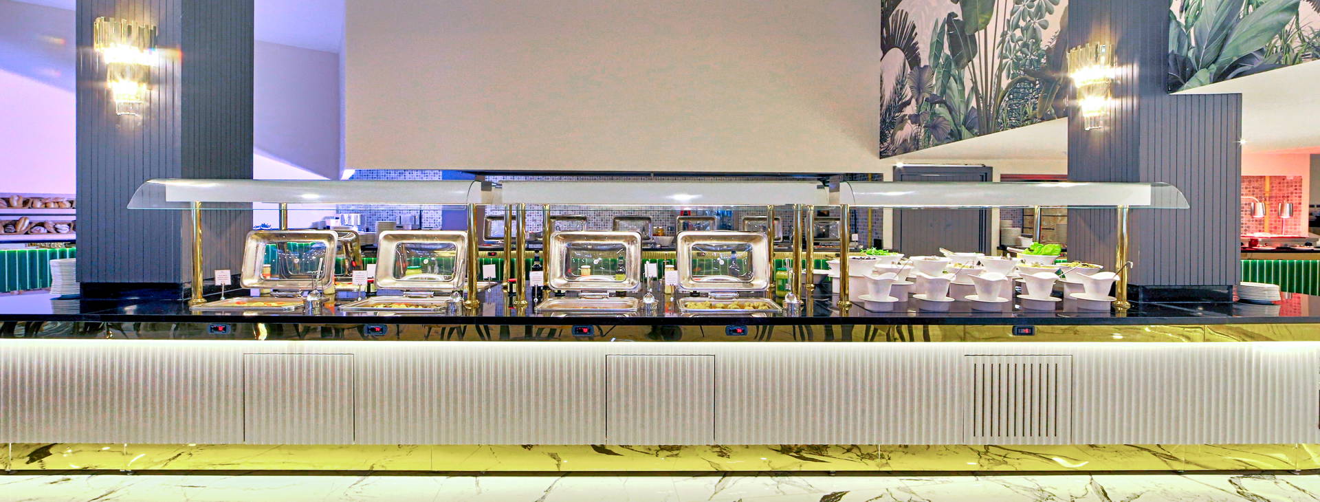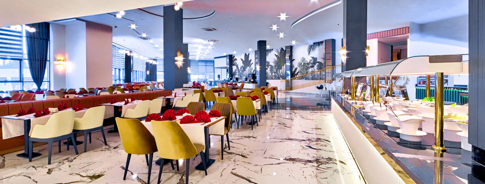 Stravovanie formou bufetu v hlavnej reštaurácii: raňajky (7:00-10:00), neskorý obed (10:00-10:30), obed (12:30-14:00), večera (19:00-21:00). Počas dňa je k dispozícii aj občerstvenie (12:00-16:00), teplé nápoje v cukrárni (16:00-18:00) a nočné občerstvenie (23:30-1:00).K dispozícii je aj a'la carte reštaurácia Wine House, ktorá ponúka jedlá svetovej kuchyne (jedna večera za pobyt zdarma, rezervácia nutná).