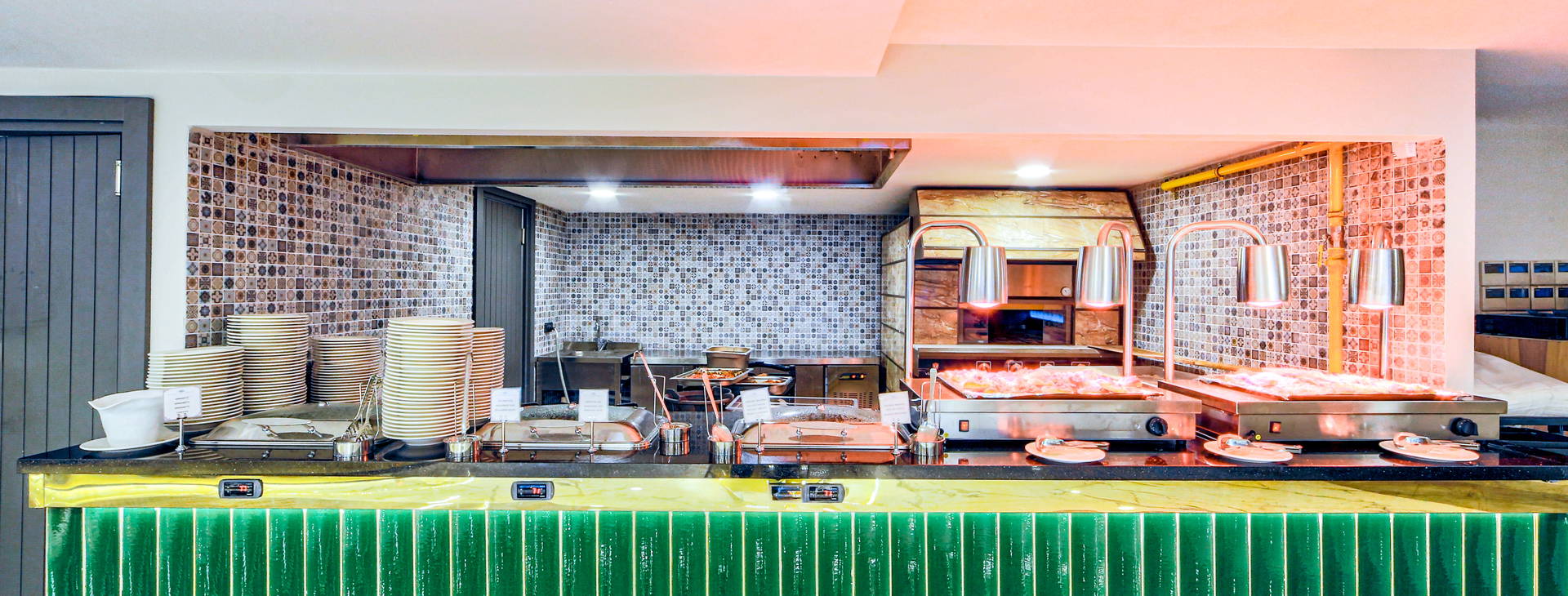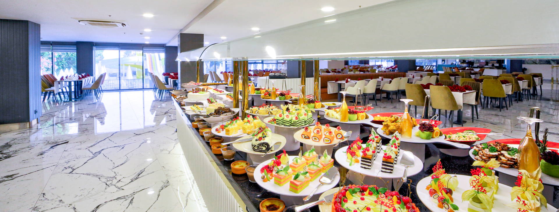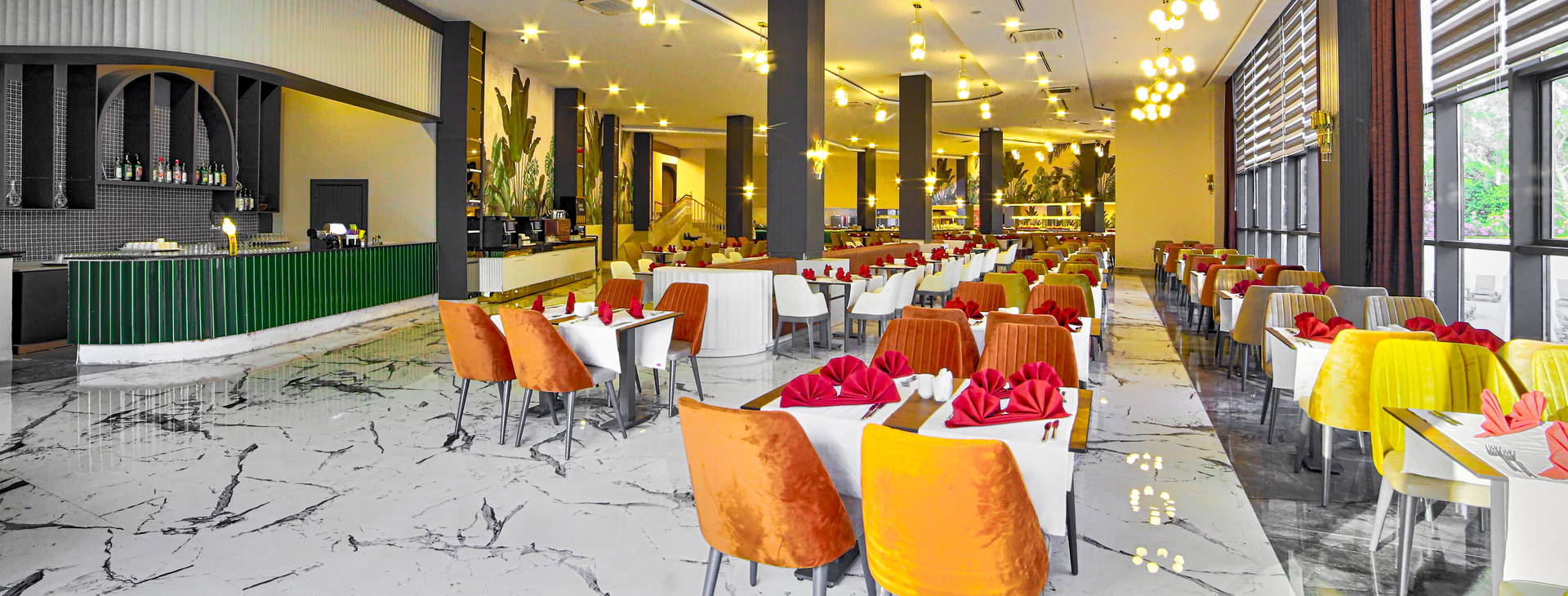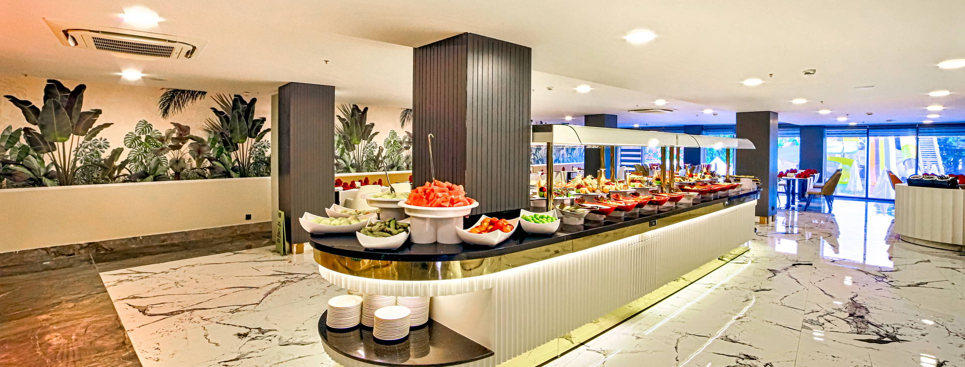 Stravovanie formou bufetu v hlavnej reštaurácii: raňajky (7:00-10:00), neskorý obed (10:00-10:30), obed (12:30-14:00), večera (19:00-21:00). Počas dňa je k dispozícii aj občerstvenie (12:00-16:00), teplé nápoje v cukrárni (16:00-18:00) a nočné občerstvenie (23:30-1:00).K dispozícii je aj a'la carte reštaurácia Wine House, ktorá ponúka jedlá svetovej kuchyne (jedna večera za pobyt zdarma, rezervácia nutná).