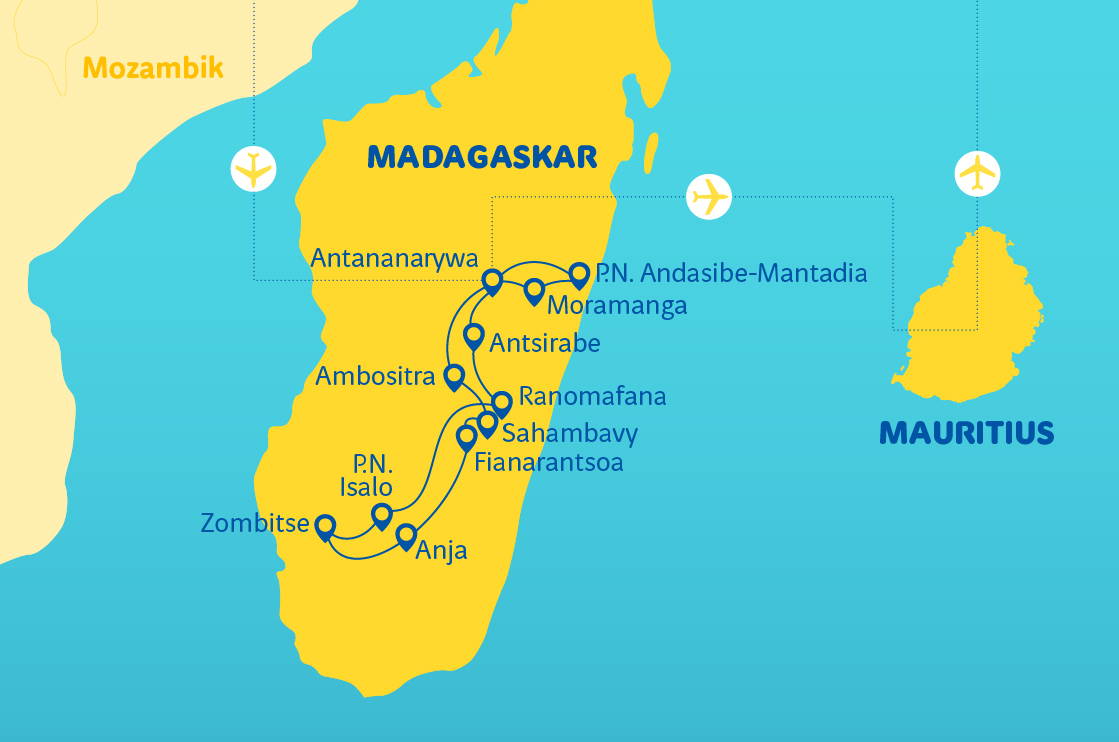 Madagaskar - červený ostrov • Antananarivo • Andasibe - země lemurů Indri • největší chameleóni světa • baobaby • Národní park Isalo - domov lemura kata, sifaka a lemura hnědého • PRÁZDNINY NA MAURICIU • přelet mezi ostrovy v ceně