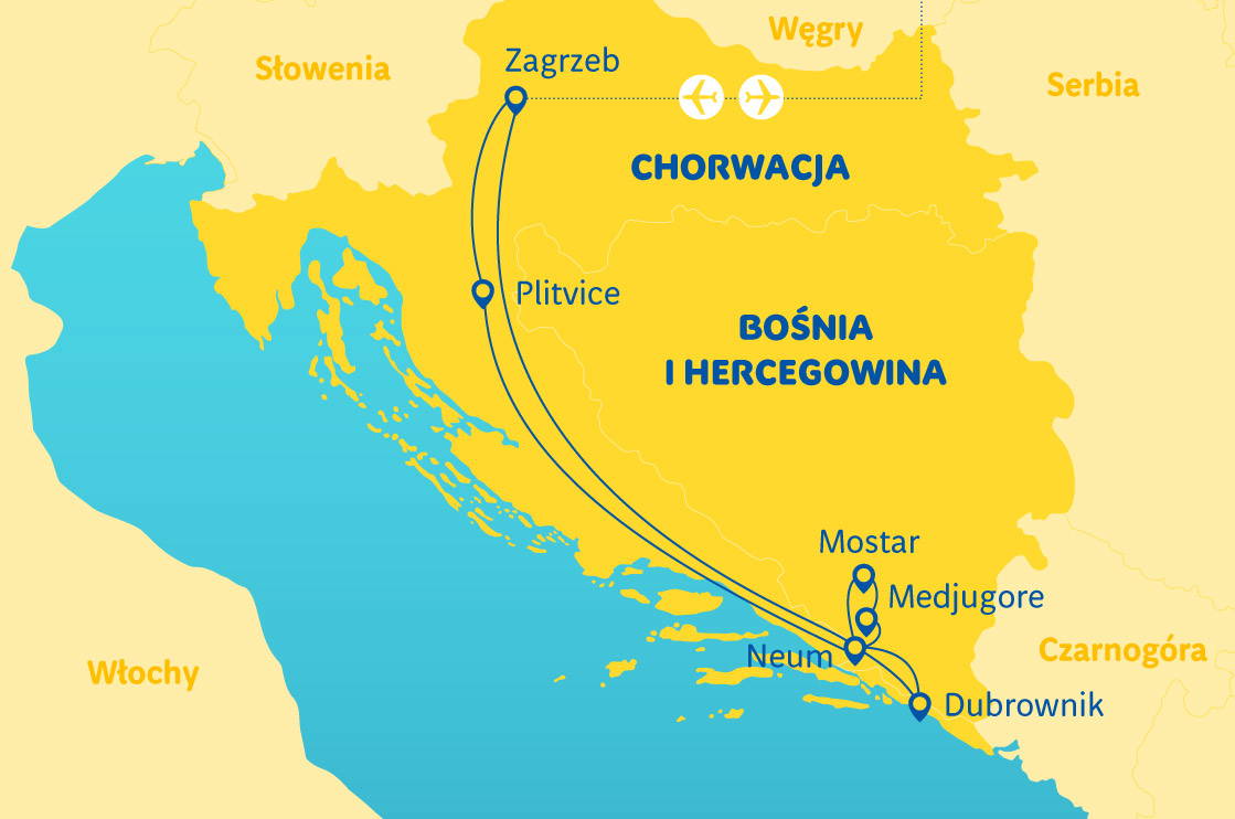 Dvě hodiny před odletem se na letišti dostavte k odbavovací přepážce Rainbow. Aktuální letové řády si prosím ověřte na r.pl/ letové řády. Po příletu transfer do hlavního města Chorvatska Záhřebu, prohlídka starého města (Gornji Grad a Kaptol), katedrála Nanebevzetí Panny Marie, kostel svatého Marka, budovy Saboru, tj. chorvatského parlamentu. Během pobytu v Záhřebu je nutné navštívit největší trh, kde najdete ty nejlepší produkty z celého Chorvatska, od pikantní slavonské klobásy kulen, přes vynikající sýry z ostrova Pag až po skvělé mořské plody. Procházku s průvodcem zakončíme na slavném náměstí Bana Jelačiće, které se často stává malebnou scénou mimo jiné při oslavách úspěchů chorvatských sportovců. Po prohlídce volný čas, během kterého můžete navštívit velmi zajímavá záhřebská muzea, jako je Muzeum narušených vztahů nebo unikátní Muzeum kravaty, která vznikla v Chorvatsku. Přejezd do Neumu, jediného přímořského letoviska v Bosně a Hercegovině, večeře a nocleh v Neumu.