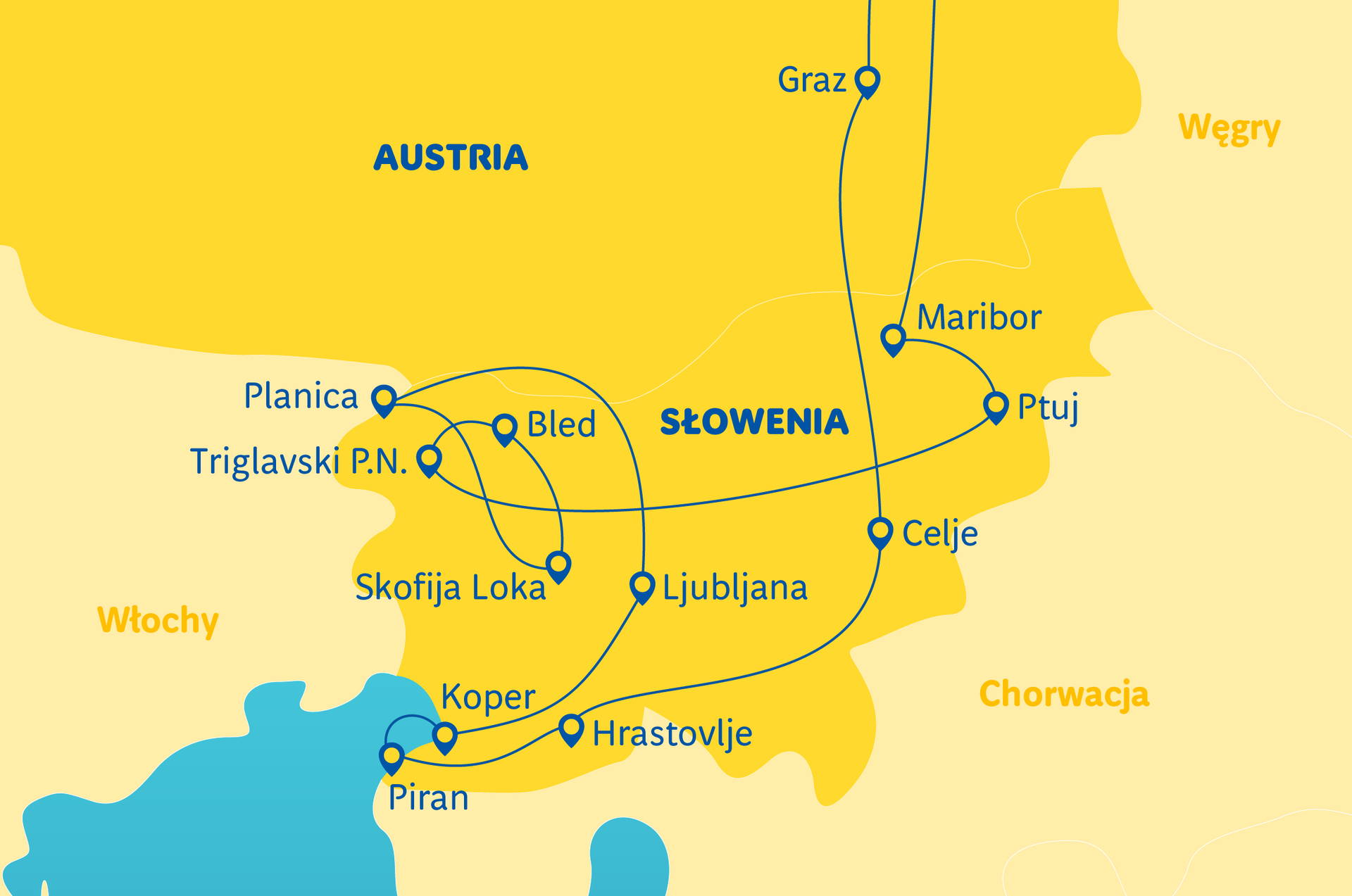 Bled - jediný slovinský ostrov • slavný skokanský můstek v Planici • Škofja Loka • Lublaň - hlavní město Slovinska • Škocjanské jeskyně • Piran • Lipica • Celje • Ptuj • Maribor • čas na odpočinek u Jadranu • Graz • noční Vídeň