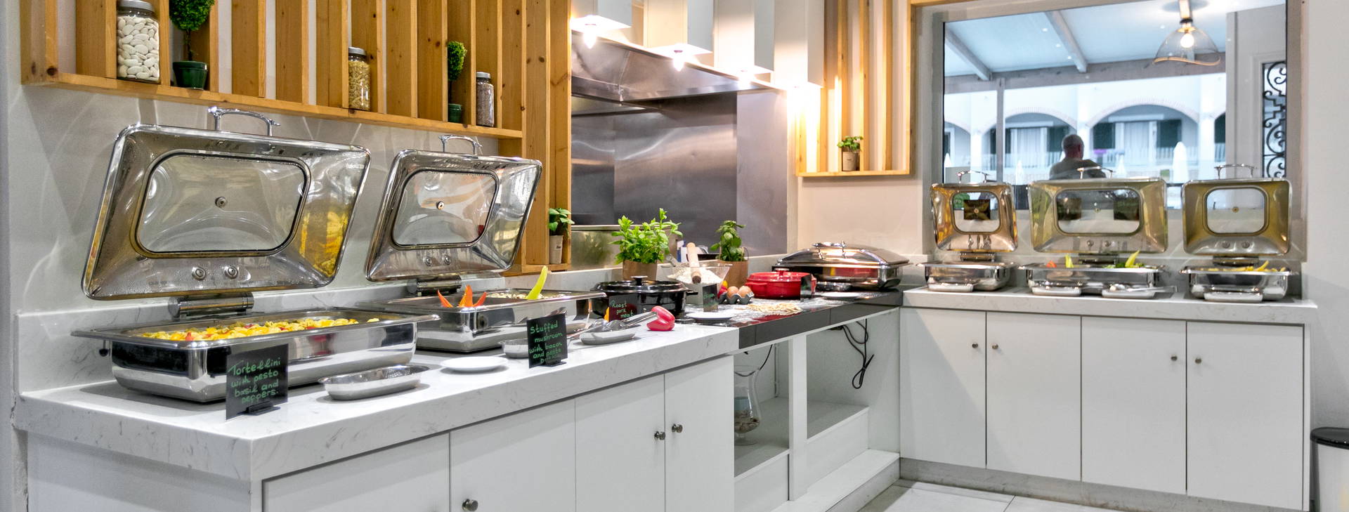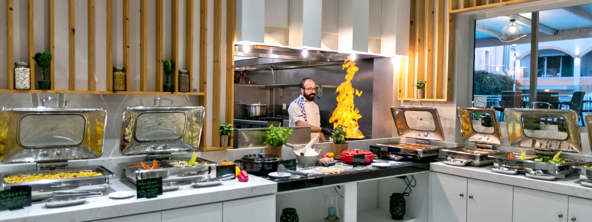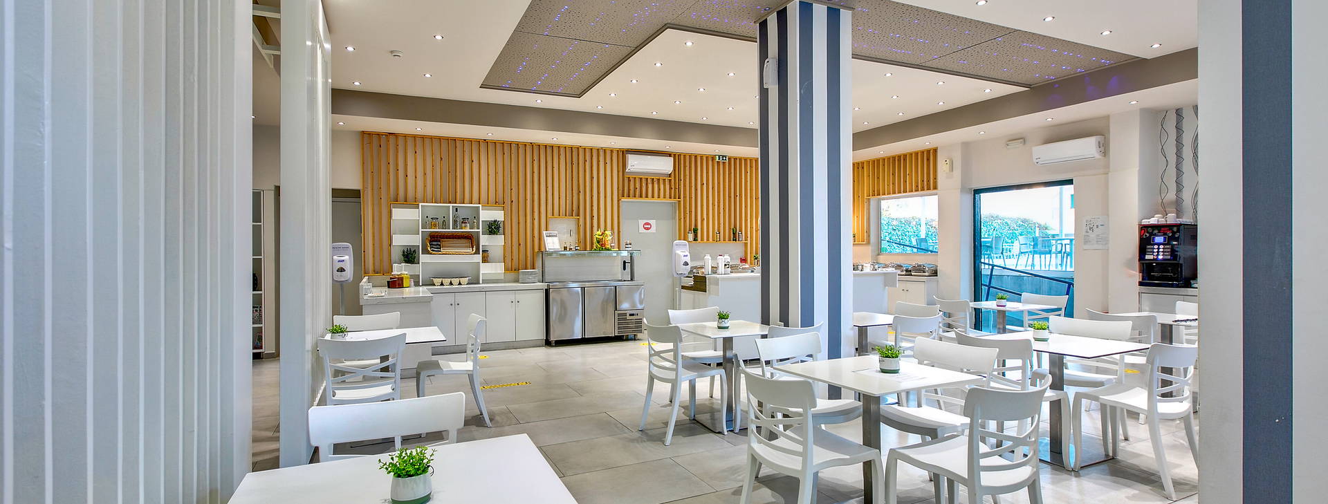 Hotel má bufetovú reštauráciu, v ktorej sa podávajú jedlá stredomorskej kuchyne. Raňajky (08:00-10:30), obedy (13:00-14:30), večere (19:30-21:00). Okrem toho je k dispozícii občerstvenie (11:00-12:15, 15:00-16:45) a nápoje a nápoje (11:00-23:00). Okrem toho reštaurácia ponúka sendviče a ovocie so sebou s denným predstihom.