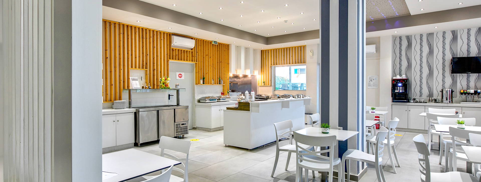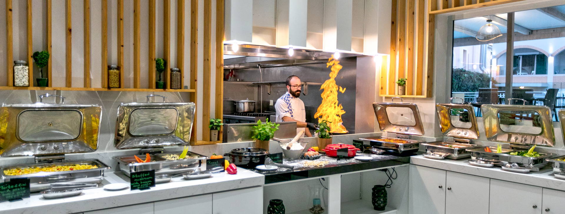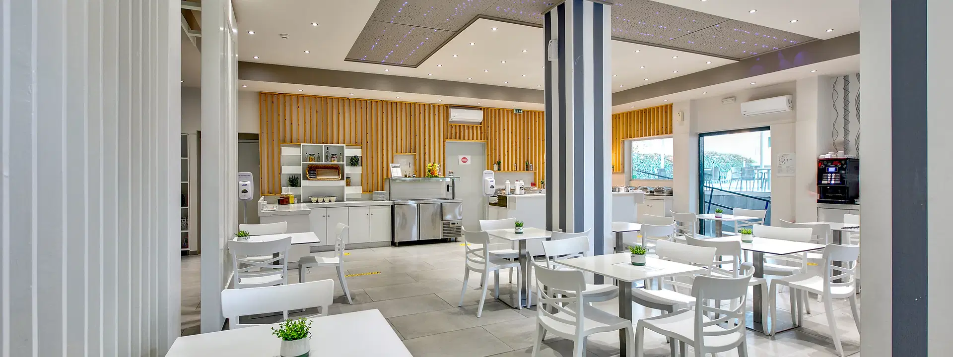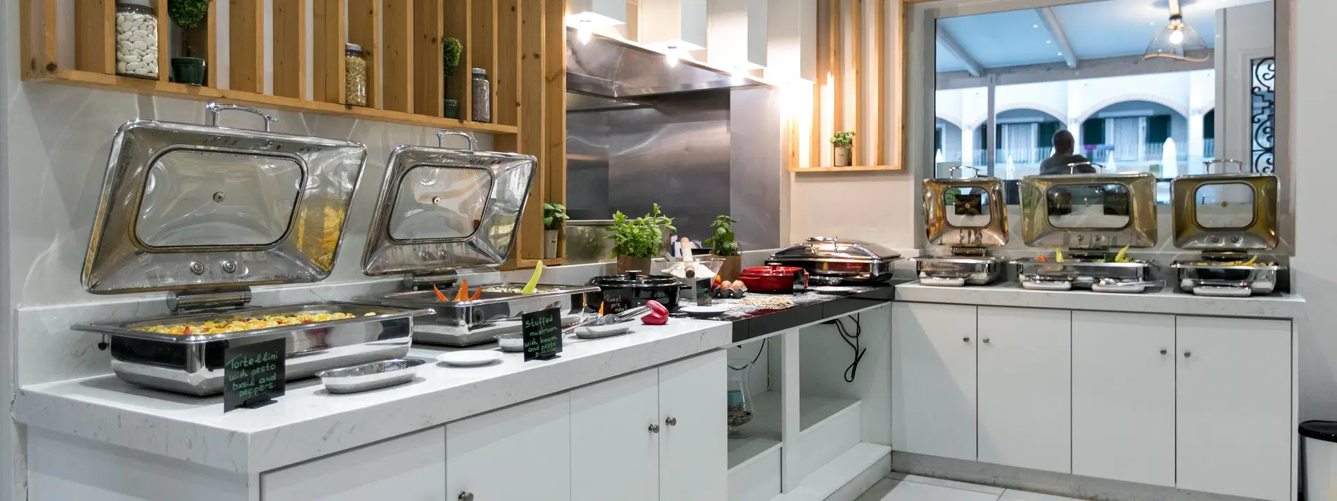 Hotel má bufetovú reštauráciu, v ktorej sa podávajú jedlá stredomorskej kuchyne. Raňajky (08:00-10:30), obedy (13:00-14:30), večere (19:30-21:00). Okrem toho je k dispozícii občerstvenie (11:00-12:15, 15:00-16:45) a nápoje a nápoje (11:00-23:00). Okrem toho reštaurácia ponúka sendviče a ovocie so sebou s denným predstihom.