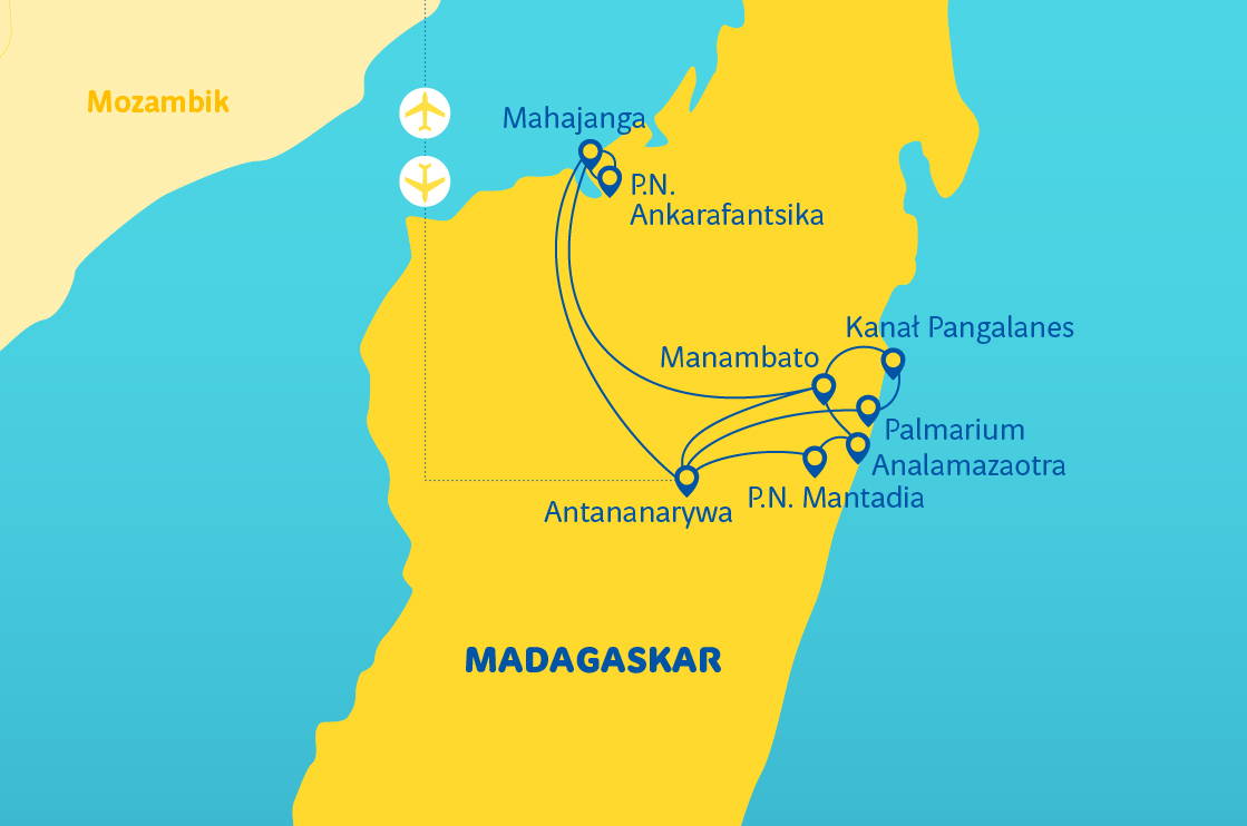 Cena zahrnuje: Let pravidelnou linkou do Antananariva a do Varšavy (s přestupem v Etiopii), letištní poplatky, ubytování v hotelech nebo lodžích standardu *** 12 započatých hotelových nocí (strava: snídaně a večeře), transfery autobusem, péče polského pilota, turistický program, jak je uvedeno výše. a pojištění TU Europa (NNW, KL a zavazadla).