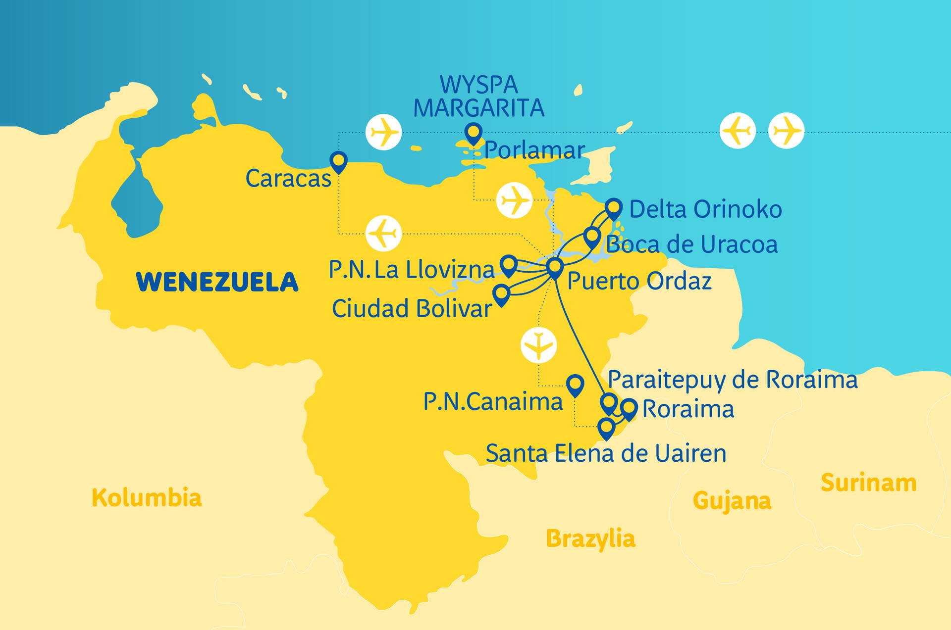 Výstup na Roraimu - nejvyšší tepui (stolovou horu) Venezuely • Národní park Canaima - dobrodružství v srdci džungle • Salto Angel - nejvyšší vodopád světa • vodopády parku La Llovizna • delta Orinoko - země indiánů Warao • Caracas - město plné kontrastů
